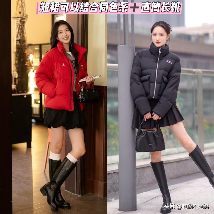 短款的裙裝它的版型狀態,我們也可以適當的去提醒一下它的高腰位置的特徵,並且下半部分要選擇長靴的話,一定是簡約的設計且能夠與這一個短裙爲同色系列的直筒型靴子,呈現出來的效果依賴的話,因爲同色系能夠起到縱向拉長的效果而來的話能夠讓我們的腿型狀態非常纖細。