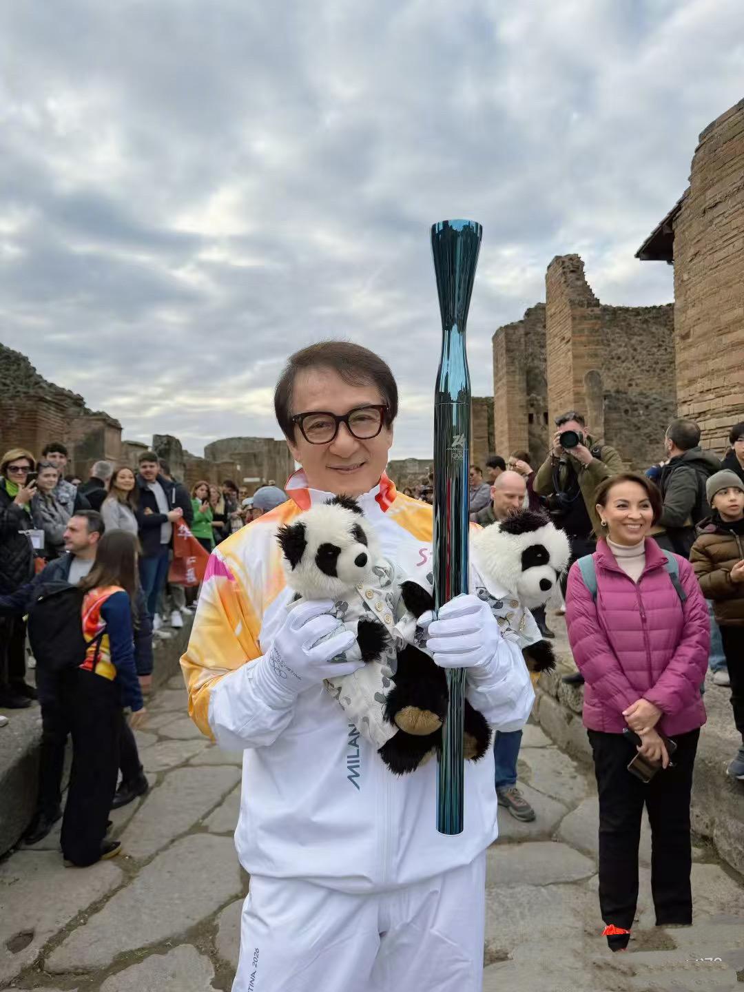 在龐貝火炬傳遞的成龍大哥,穿一身白色運動服,抱着大熊貓玩偶與火炬合影,時刻都不忘弘揚中國文化。