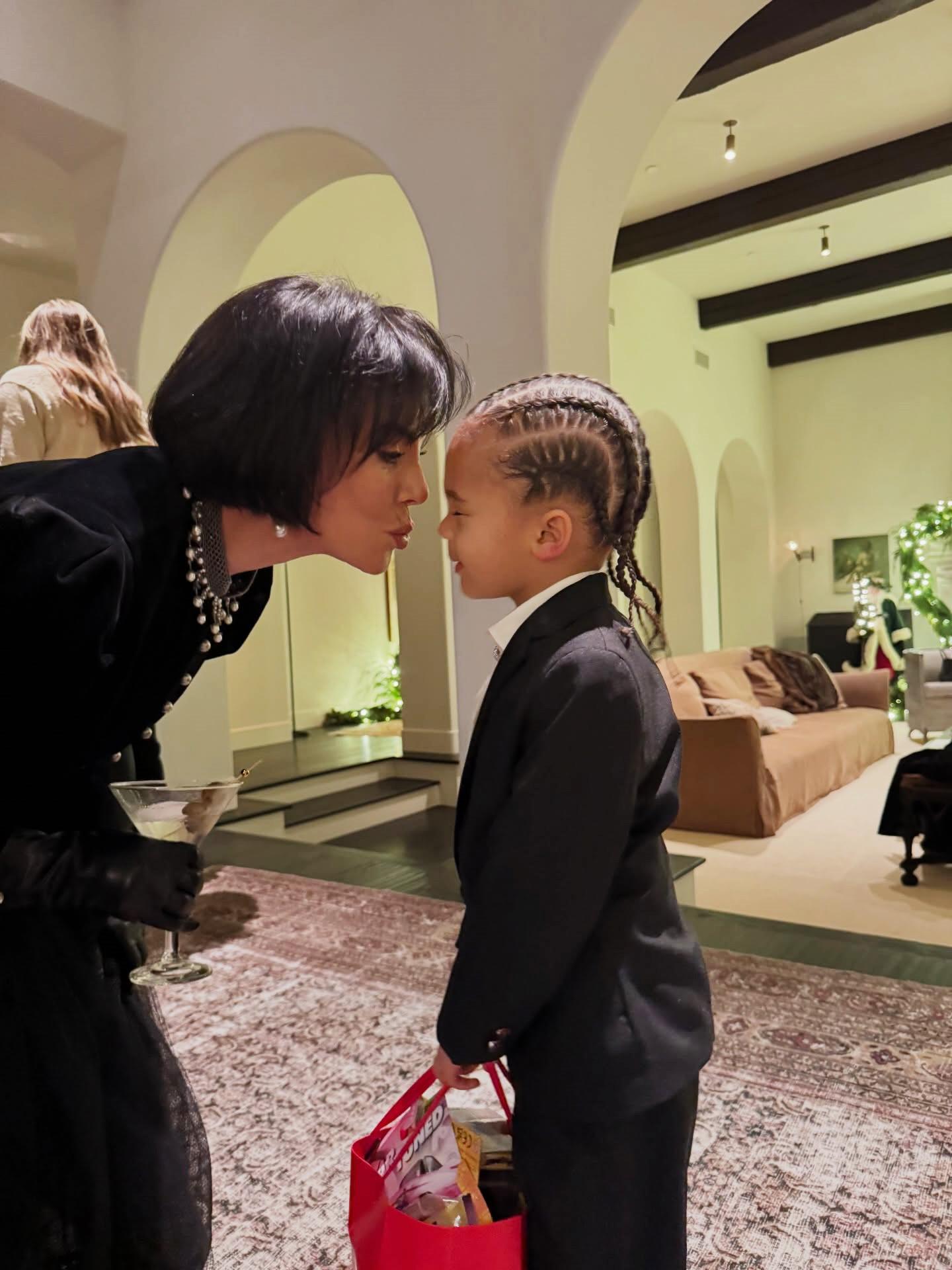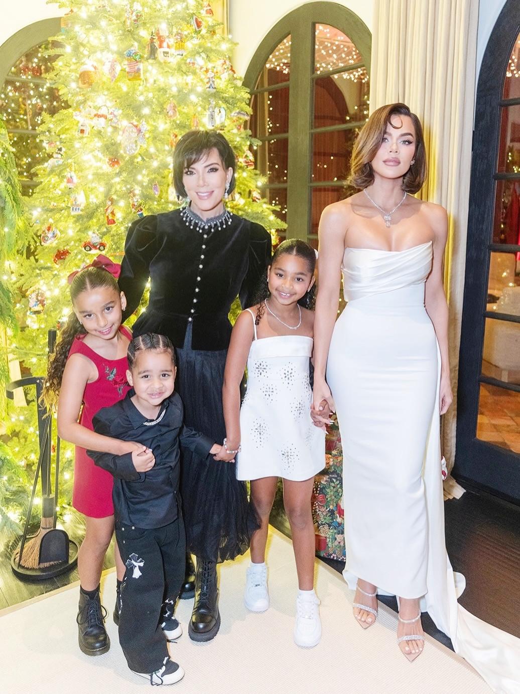 家庭合影中的溫情更令人動容。克里斯與 41 歲的女兒科勒・卡戴珊同框,科勒身着白色無肩帶絲綢禮服,復古優雅宛如老好萊塢女星,身邊 7 歲的特魯與 3 歲的塔圖姆穿着節日盛裝依偎身旁,祖孫三代的暖心畫面直擊人心。