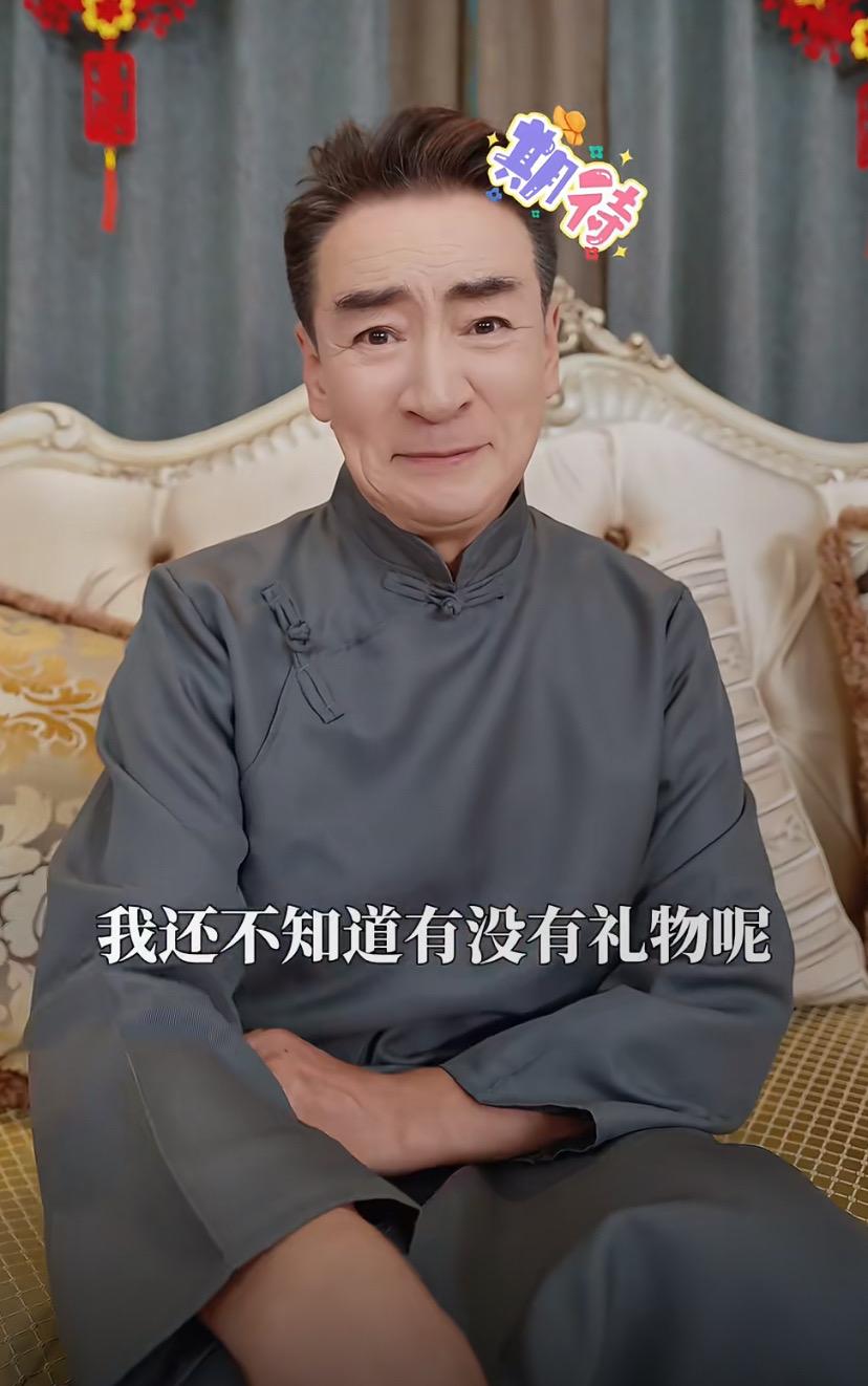 穿上長袍,還是劇中的形象,但額上的皺紋更深了,眼神也沒有那麼凌厲,滿是老父親的溫柔。