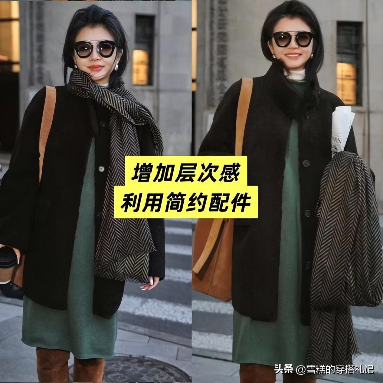 很多人都覺得這種短款的黑大衣一點都不好做穿搭,大家可以多看看三木博主的搭配技巧,她裏面選擇一件稍微長一些的毛衣裙,長度和大衣有一定的對比,讓整體的層次很強,而且這種內長外短的搭配也更讓人眼前一亮,因爲大衣是V領的設計,所以她還搭配了一條很寬的格紋圍巾進行點綴,整體看着更加有層次感一些,但是記得選擇材質軟糯一些的,不要太厚,否則容易顯臃腫。