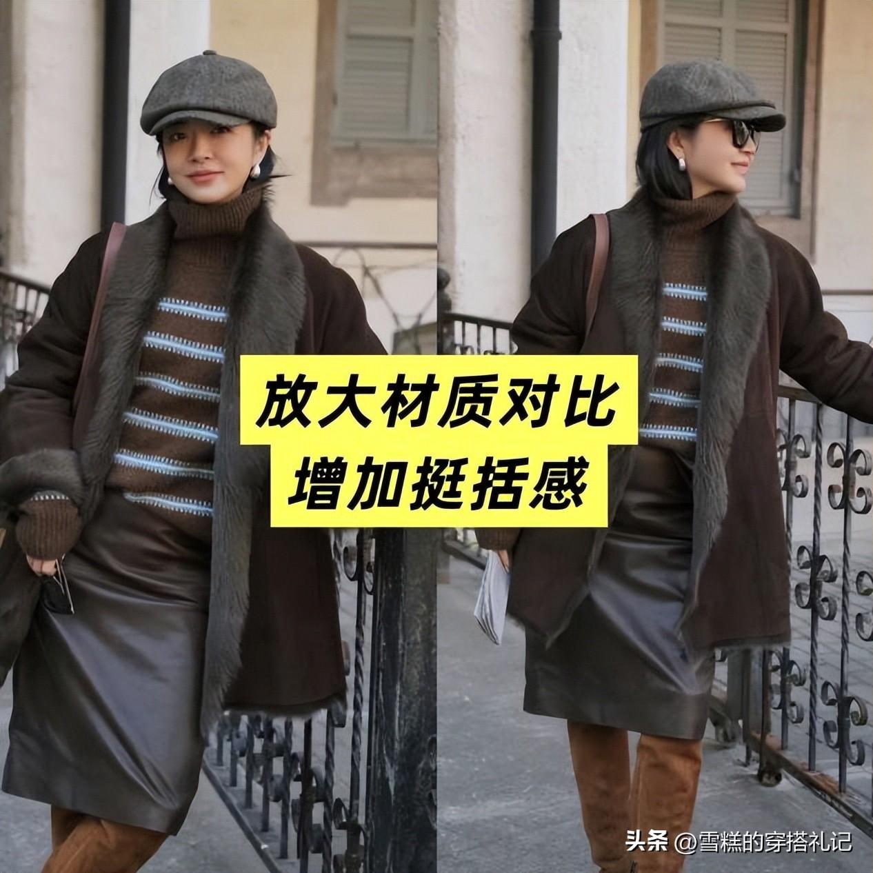 如果你覺得大衣穿起來過於休閒與中性,那麼可以將褲子改成半身裙,像三木博主就選擇了一條材質非常挺括的皮裙,一是版型很好,看着相當有質感,二是微微帶了一些開叉的小設計,視覺上更加有造型感,而且皮革與毛呢也有一定的材質差距,上身的質感賊棒。