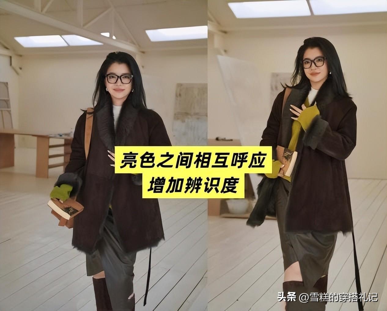 你是不是還在穿黑色大衣配白襯衫、白毛衣,早就out了!三木博主的搭配早就已經是next level了,黑色大衣配鹹菜綠打底衫,在黑色與亮色的組合下,瞬間變得時尚起來,而且鹹菜綠真的超級顯白,襯得皮膚格外白皙透亮,但如果不想整體太浮誇,建議大家可以在其他鞋子、包包或者圍巾等小物件上加入同色系的單品進行呼應,看起來更加協調一些。
