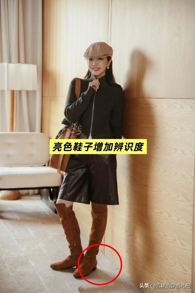 服裝基礎的時候,鞋子就不能太基礎,如果鞋子也和大衣同屬於基礎色的話,很容易給人一種平淡的感覺,不夠出彩,因此三木博主搭配了一雙酒紅色的尖頭靴,酒紅色屬於亮色的一掛,瞬間製造了整個造型的亮點,讓整體看起來時尚又洋氣,同時還能夠更好的增加辨識度,而尖頭的靴子也可以幫助你更好的優化腿部的線條,達到拉伸腿長的效果,強烈建議大家嘗試一下。