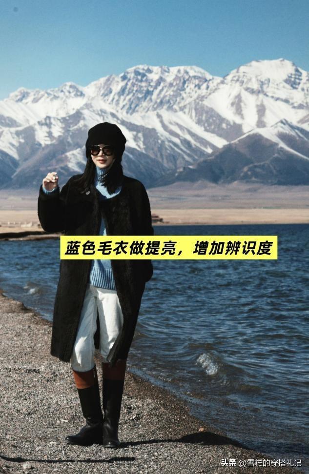 大衣選擇黑色之後,整體的配色會更加保守一些,所以其他的單品可以選擇得更加亮一點,比如這套藍色毛衣和白色牛仔褲的組合,幫助壓低黑色的沉悶感,整體都瞬間輕盈了許多,但是記得選擇低飽和度的藍色會更好,上身之後會更加顯白一些。