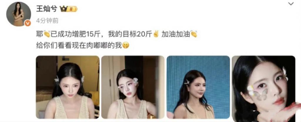 從2024年11月份算起來,王燦的目標是增肥20斤。目前來看,她應該是完成了自己定的任務,肉嘟嘟的臉圓潤富態,身材也更豐滿了。