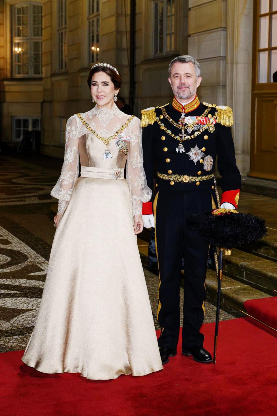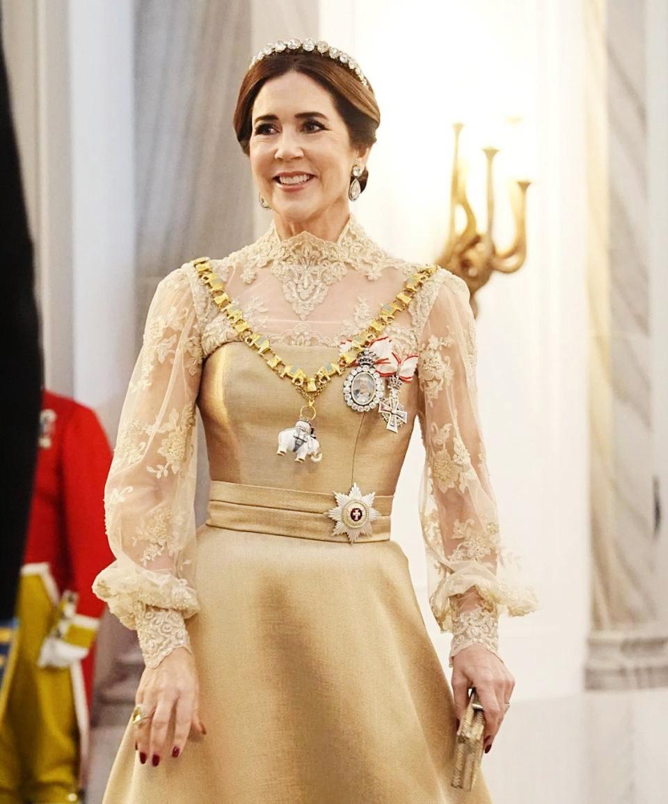 2026年元旦之夜,哥本哈根阿美琳堡宮的燈火如星河璀璨,丹麥王室新年國宴在此如期舉行。53歲的瑪麗王后一襲米色蕾絲長裙驚豔亮相,裙襬流轉間宛若碧波盪漾,被丹麥媒體盛讚爲“液體裙”,成爲全場無可爭議的焦點。
