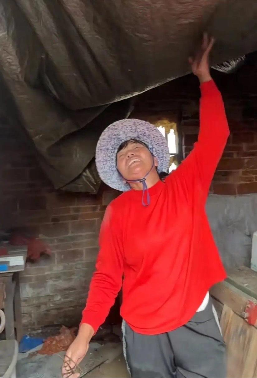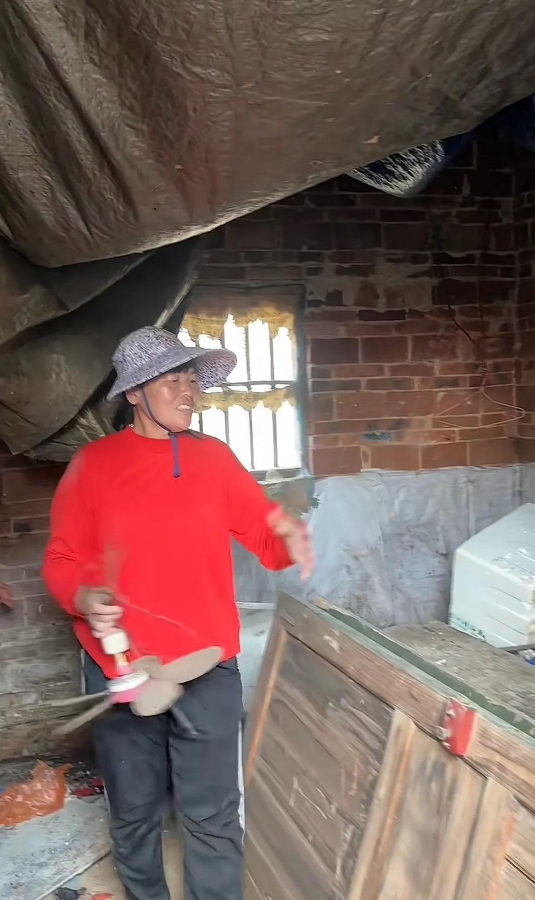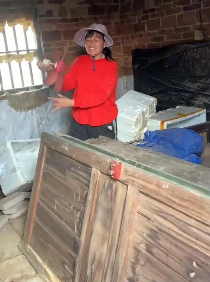 全紅嬋媽媽穿着紅色上衣、黑色褲子,還戴着一頂大檐帽。這套老舊的平房看起來有些年頭了,大概率是全紅嬋爸媽結婚時候的房子。