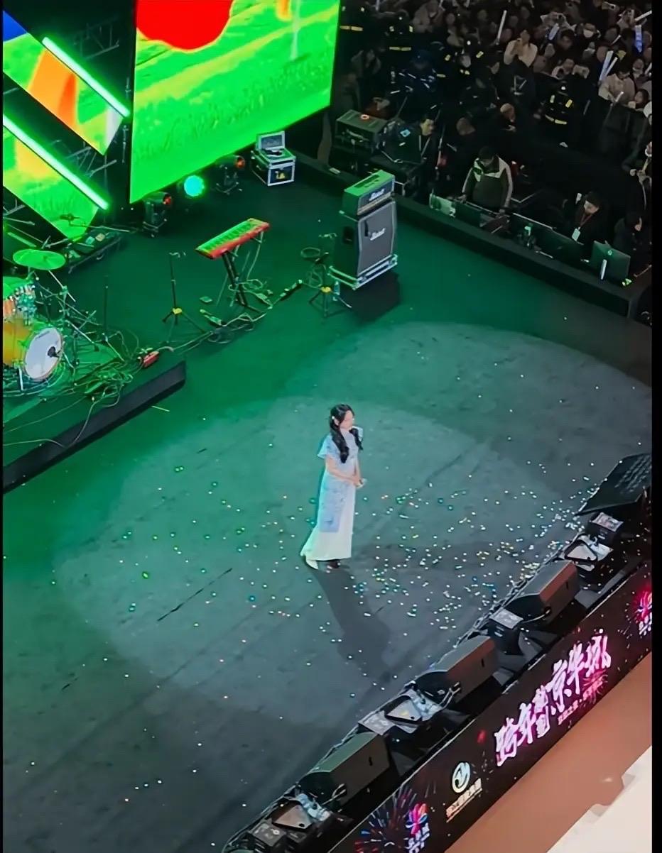 現場的觀衆都穿着厚厚的棉衣,爲了舞臺效果、金莎只能忍着寒冷穿旗袍。