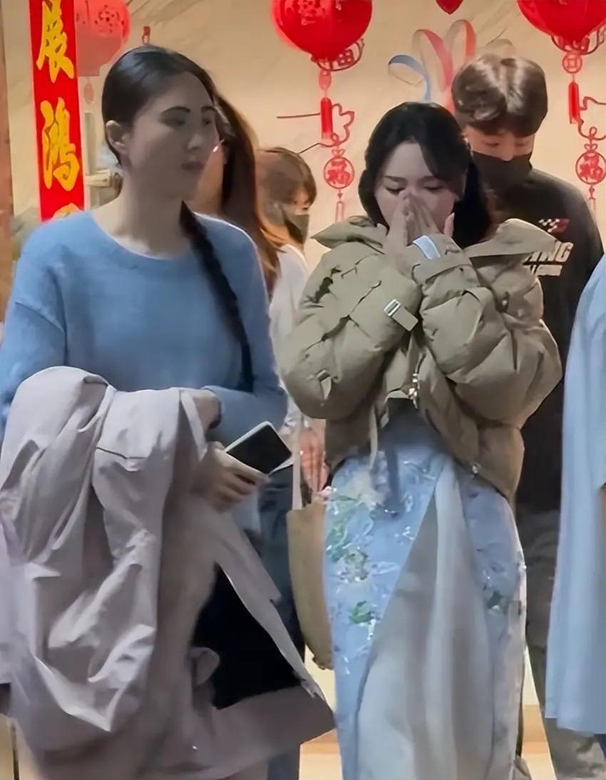 商演結束後,金莎的主力剛忙給她披上小棉襖,這時候她凍得發抖,只能靠哈氣的方式給雙手取暖。