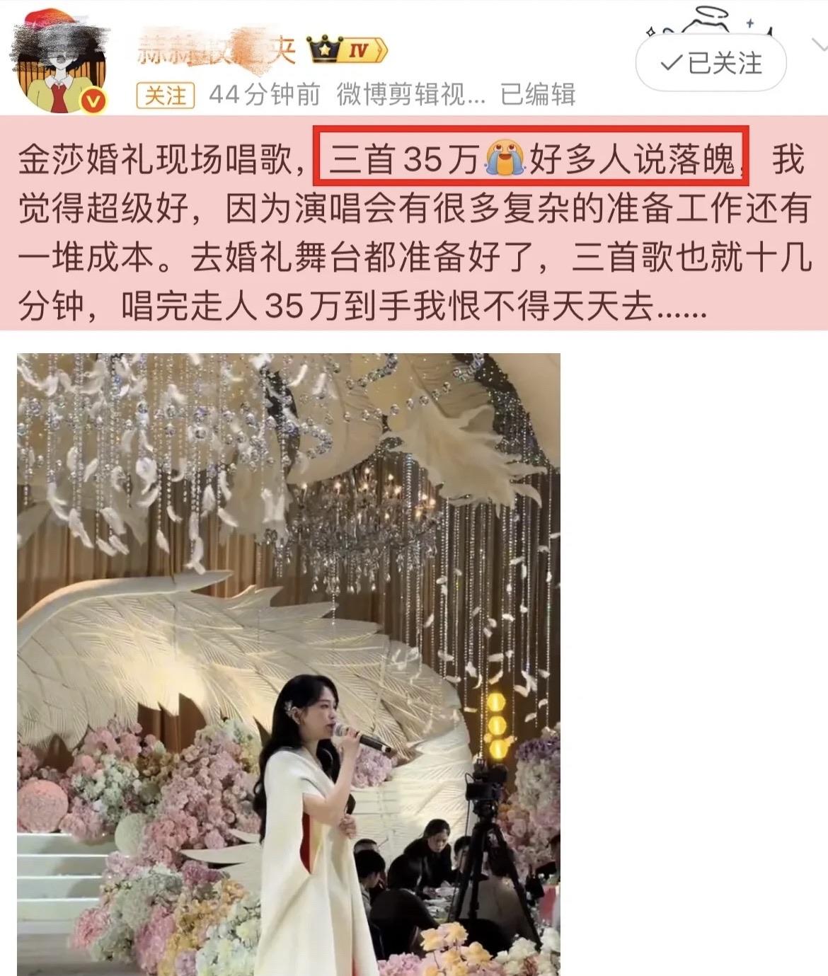 當然金莎的出場費也不低,3首歌就掙了35萬。但在動輒百萬起步的娛樂圈,這價格其實也算不上貴。