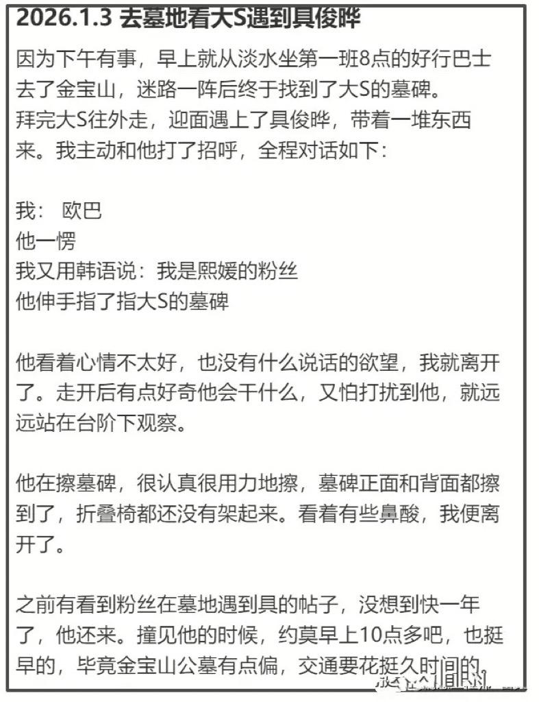 1月3日,大S的粉絲去墓地看望具俊曄。拜完大S往外走的時候,正好迎面遇到了具俊曄。