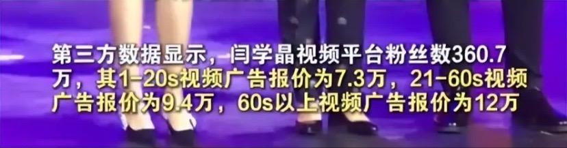 甚至閆學晶的短視頻平臺,一條20s的廣告報價就在7.3萬,如果是1分鐘的廣告就是9.4萬,而1分鐘以上的廣告報價則爲12萬。