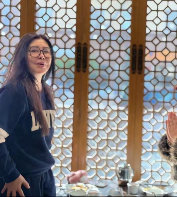 可生圖鏡頭下,就又是一番景象了。王祖賢和好友拍照,她舉着手機、雙眼有點睜不開,甚至臉頰都高高的腫起來了,這個面相不太自然。