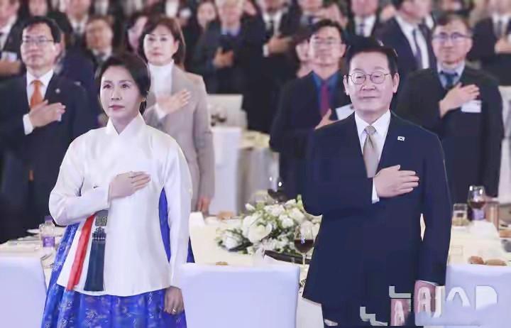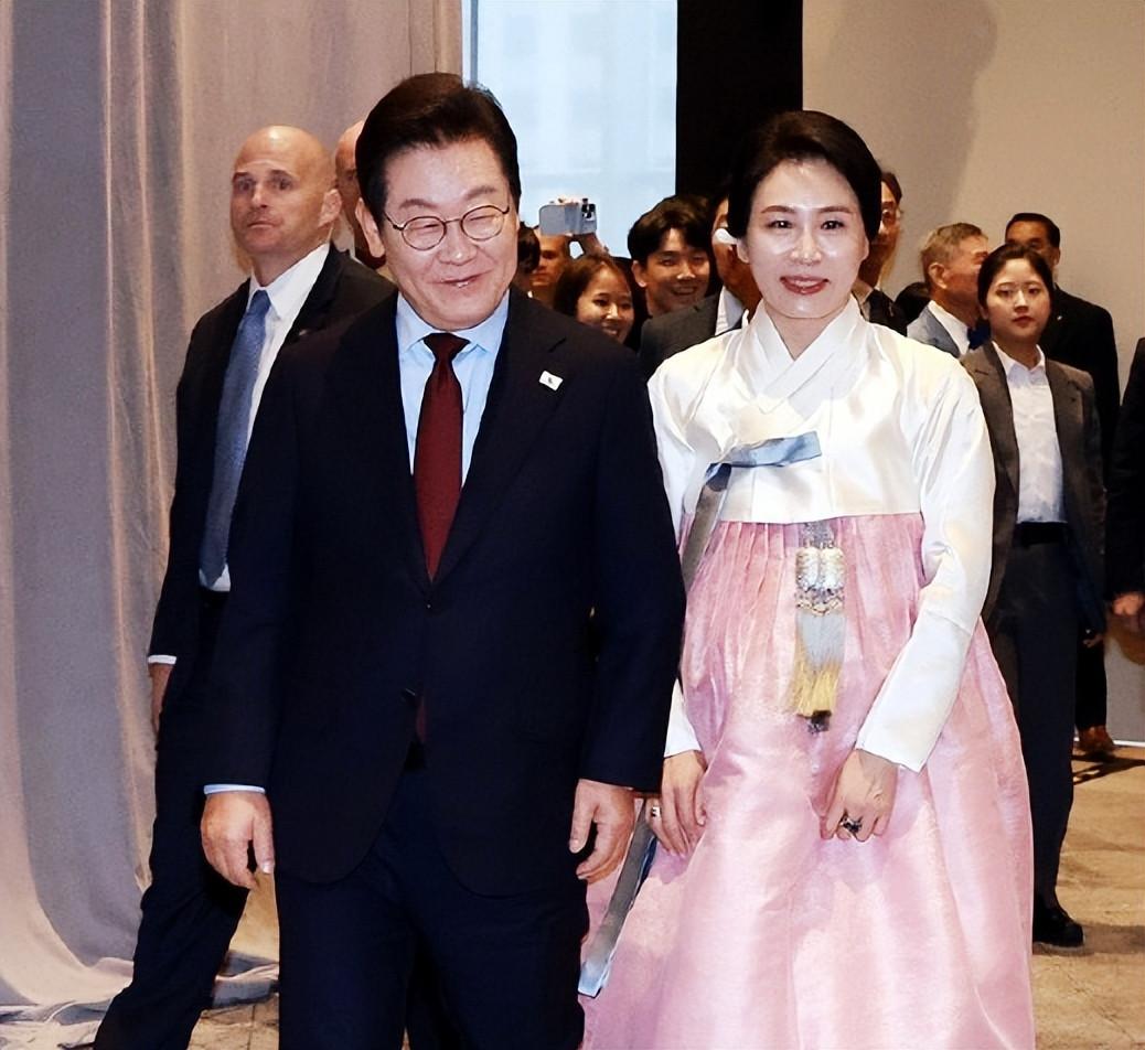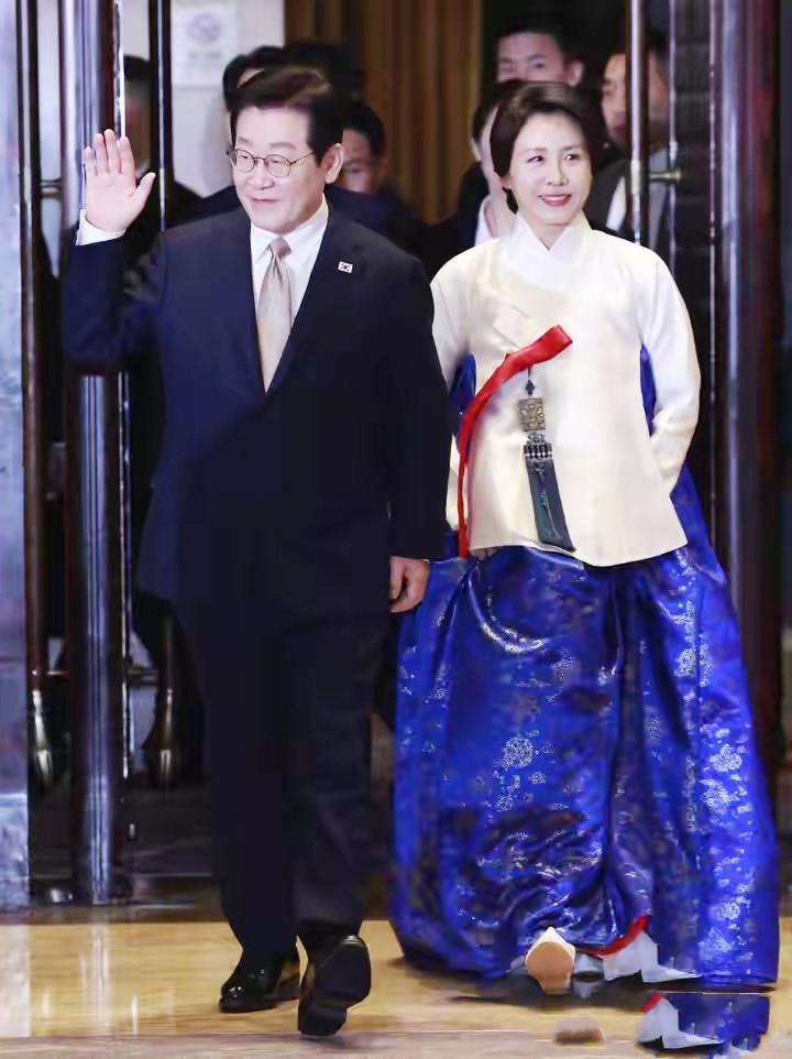 李在明身着深色正裝,將抵達機場時的紅色領帶換爲金灰色款式,簡約中透着沉穩,與金惠景的傳統韓服形成動靜相宜的呼應,恰如韓諺所云:“夫妻同席,衣韻相和”。兩人多年相濡以沫的情感,在穿搭的默契與互動的溫情中展露無遺。