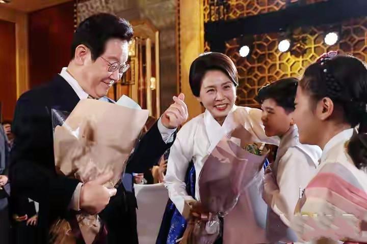相較於其他場合的正式着裝,金惠景選擇以韓服出席僑界晚宴,既契合“同胞相聚,衣承傳統”的韓式禮儀,也讓整體氛圍更顯親切。她本就肌膚白皙,搭配素雅與華麗交織的韓服,更顯溫婉氣質。而夫妻倆面對獻花小朋友時的表現,更讓穿搭的溫情倍增——兩人紛紛彎腰接過鮮花,笑容真摯溫暖,金惠景溫柔擁抱獻花男孩,李在明則俏皮比心,這般“笑靨如花待稚子”的模樣,恰如中式古語所言“慈懷見於微末”,讓身着傳統服飾的二人更添親和力。