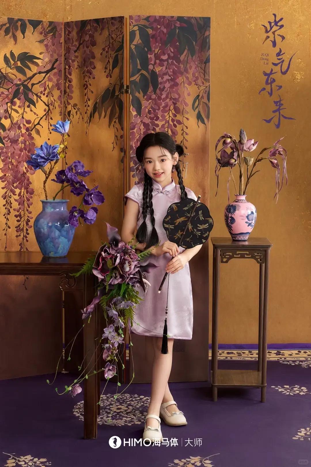 淺紫色的旗袍,配一雙白色公主鞋,點綴上長長的麻花辮,傳遞出一種書香氣。