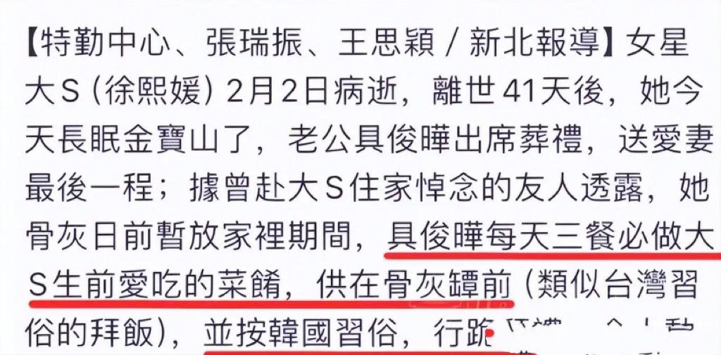 具俊曄卻擔心,如果自己不時常探望,害怕大S喫不到喜歡的食物。他每一次都會帶着很多貢品,都是大S生前喜歡的美味。