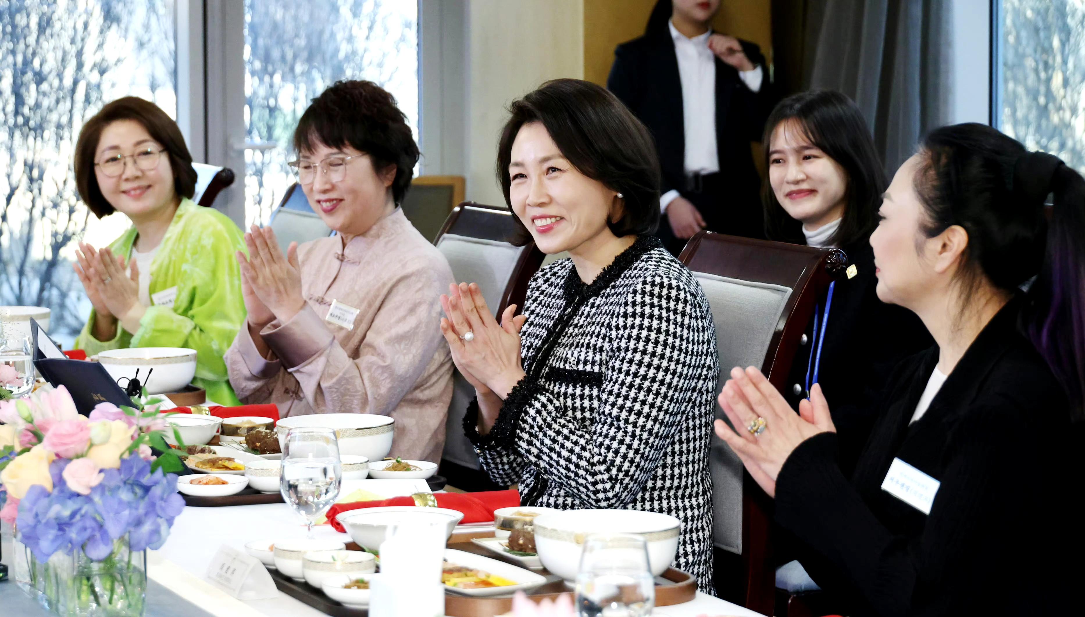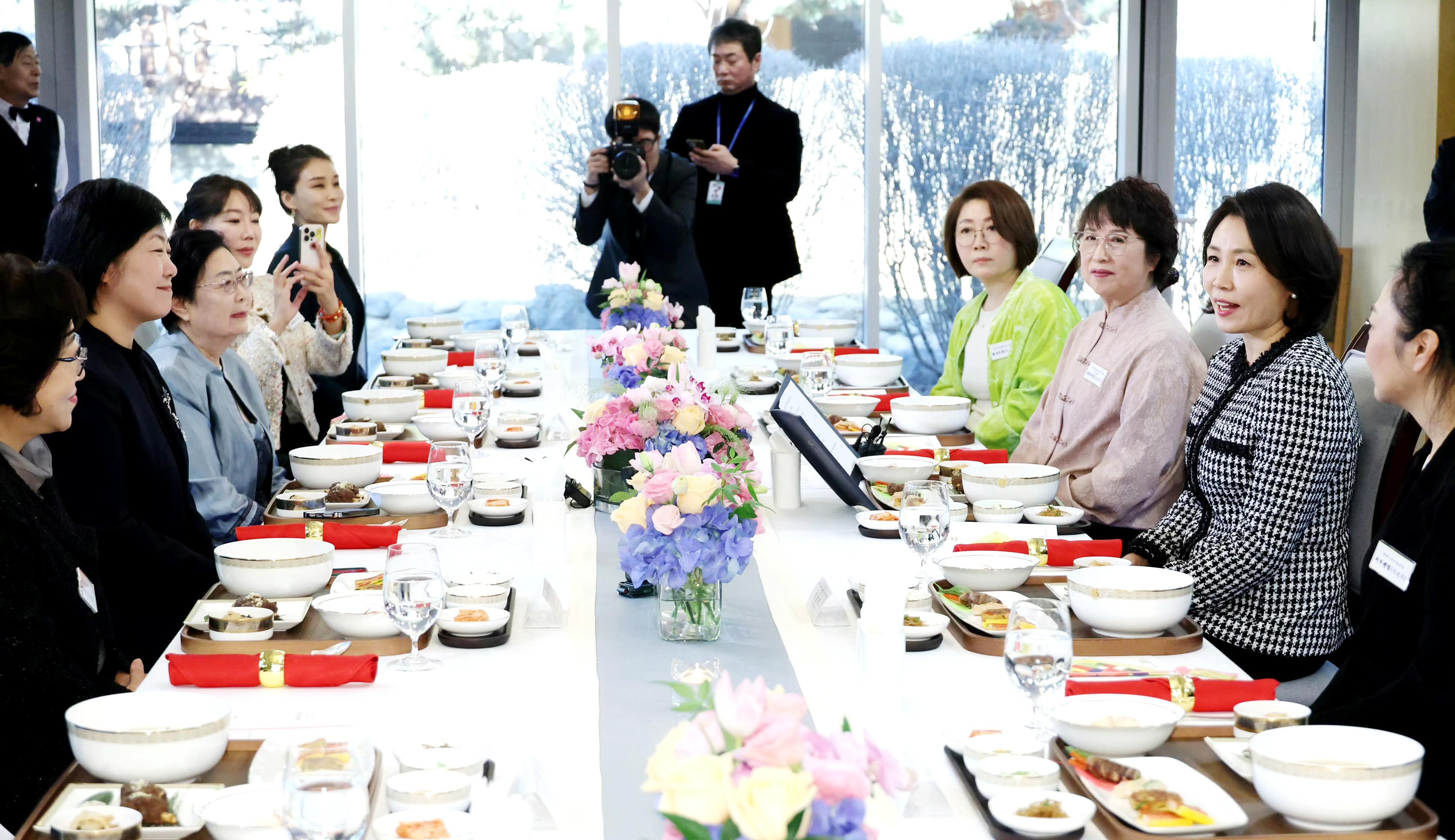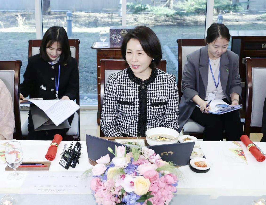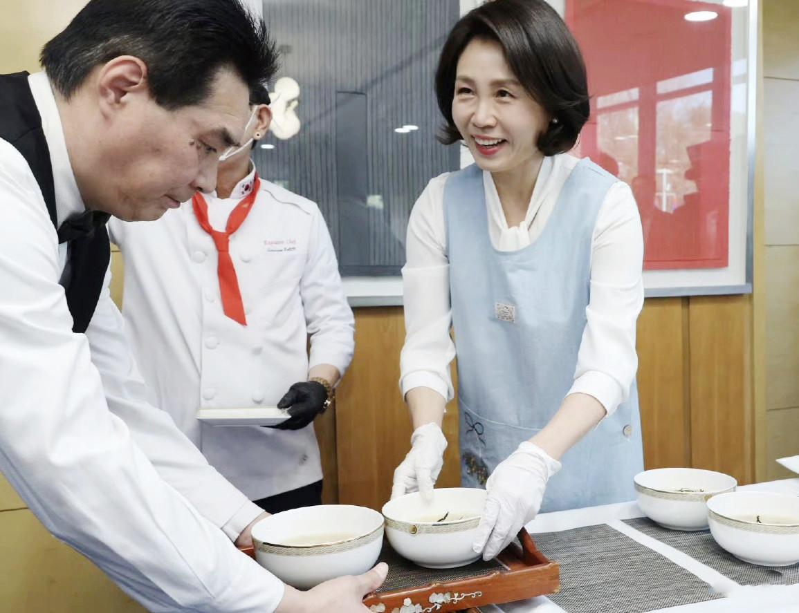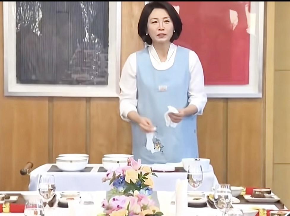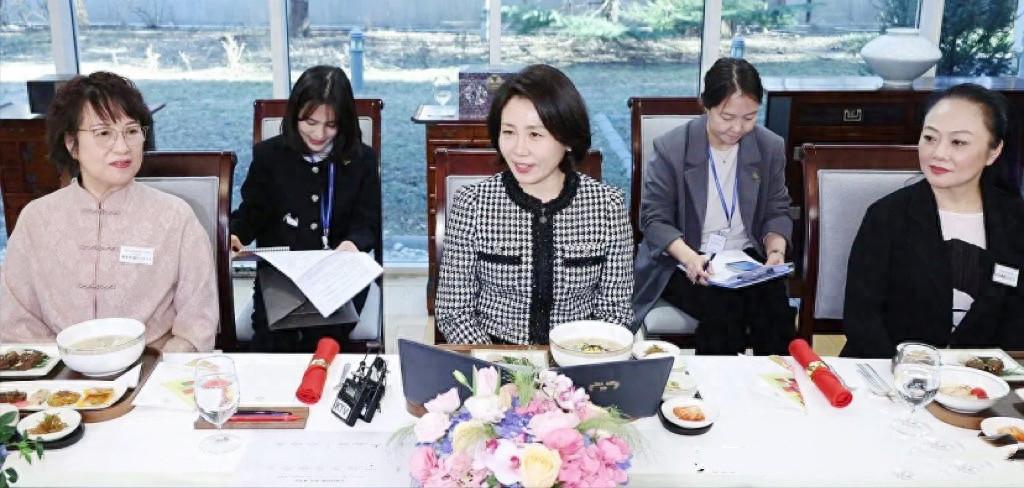 這份賢惠與細緻,在訪華期間更化作跨越國界的溫情表達。金惠景特意在官邸舉辦午餐會,邀請長期致力於關係友好的代表,親手烹製年糕餃子湯款待衆人。她繫着淺藍色圍裙,戴着手套精心操作,每一碗湯都添上分量十足的雞蛋絲,笑着坦言“媽媽們做飯都這樣,家人說好喫就會天天做”。