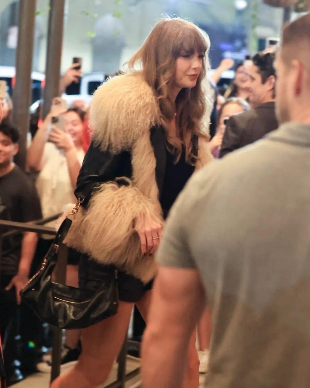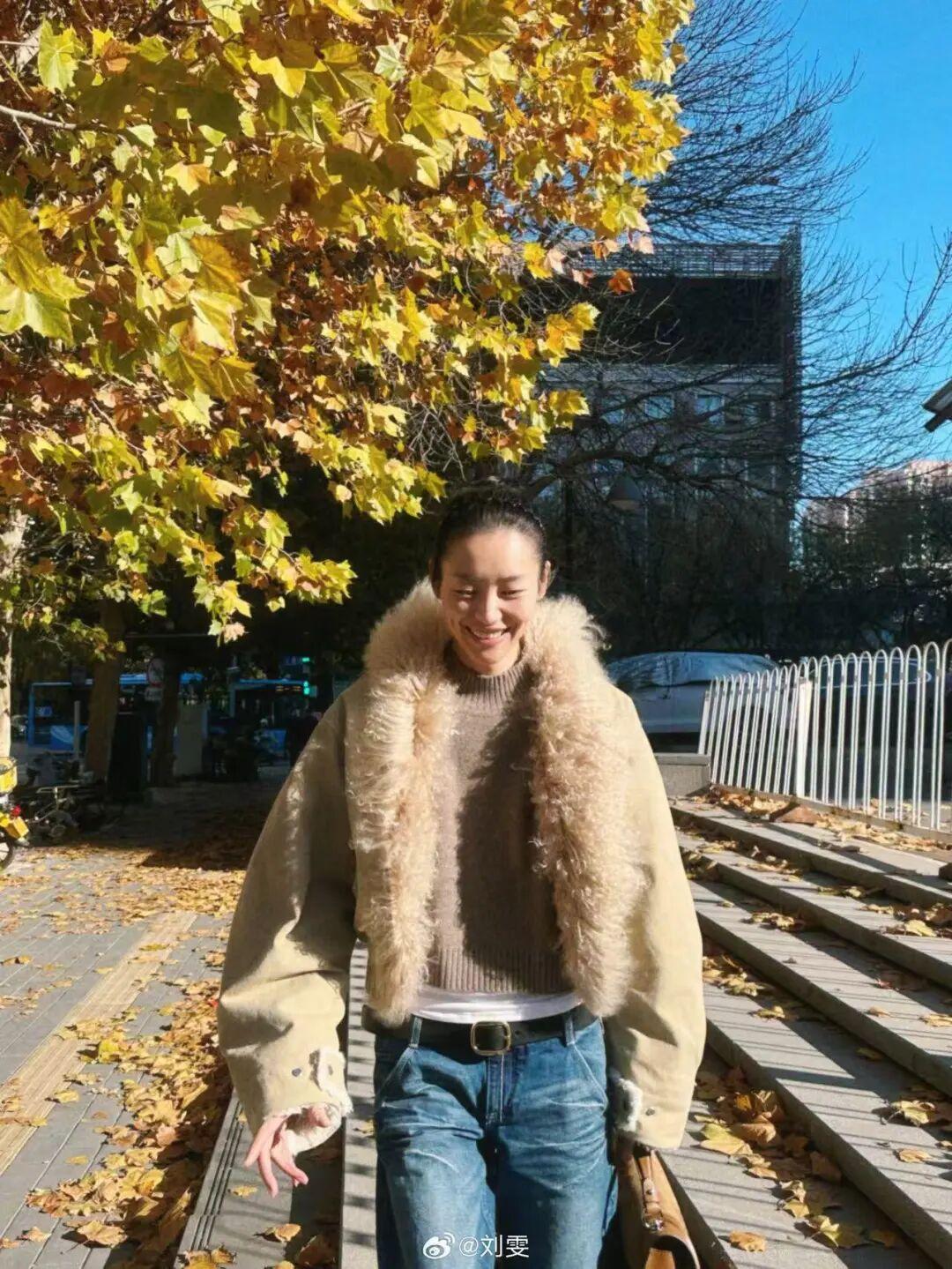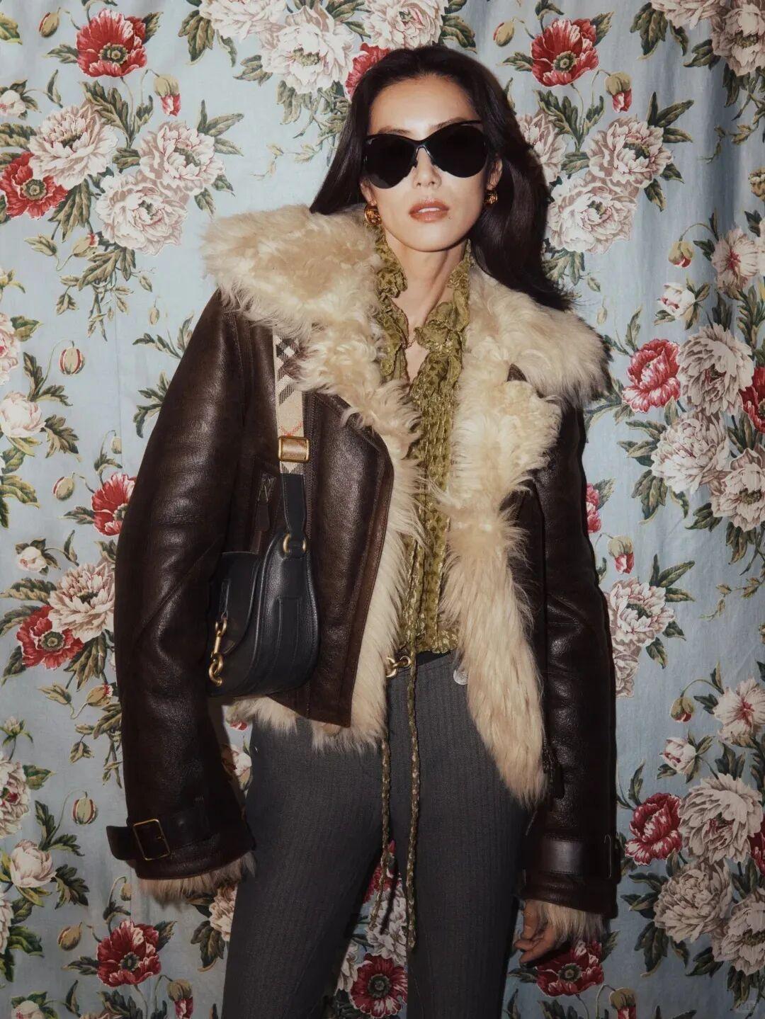 她還穿過類似 的麂皮款,顏色會更溫柔些,這件毛領視覺上更像一條厚實的毛絨披肩,既保暖又 能穿出氣場,來自 國內設計師品牌 Med ium Well, 領口是灘羊毛, 參考價爲2580元。 ▼