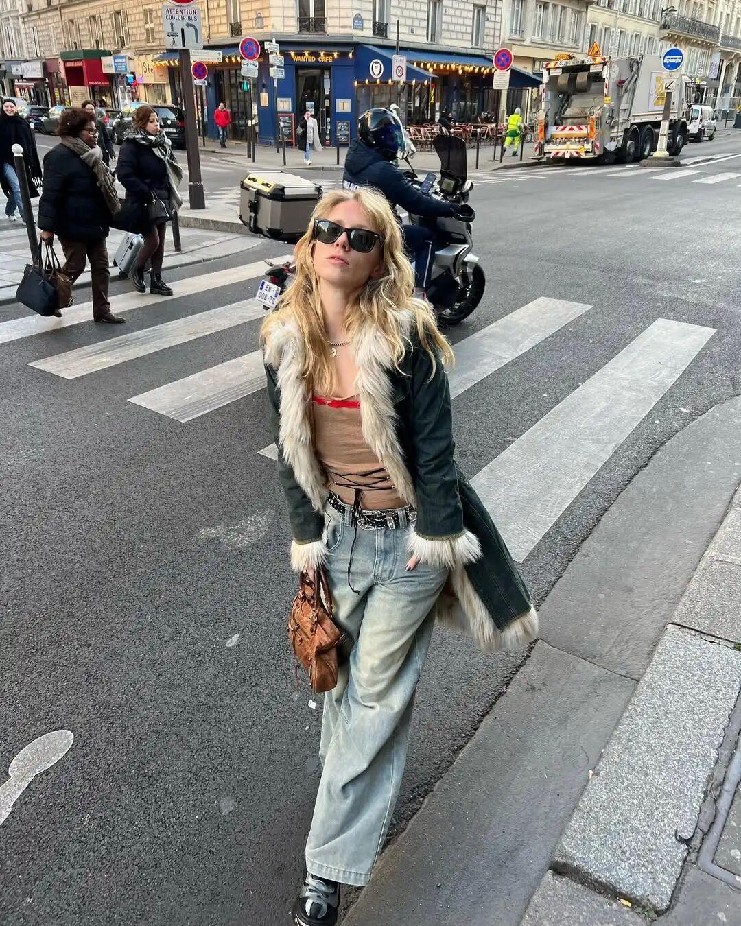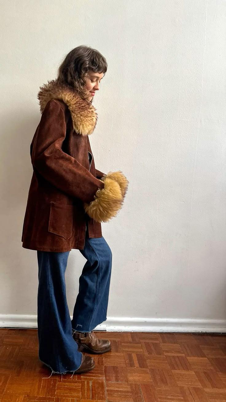 如果你剛好有一頭捲髮,可以試試麂皮毛領外套+喇叭褲,就很還原70年代的復古嬉皮風▼