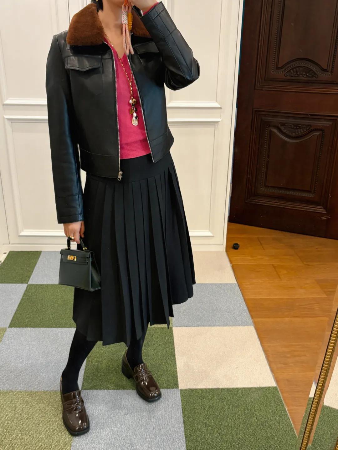 我們亞洲人普遍骨架、量感比較小,而皮質本身帶有厚重的質感,更不要說再加上一圈毛毛,太長的外套真的容易把人喫掉。