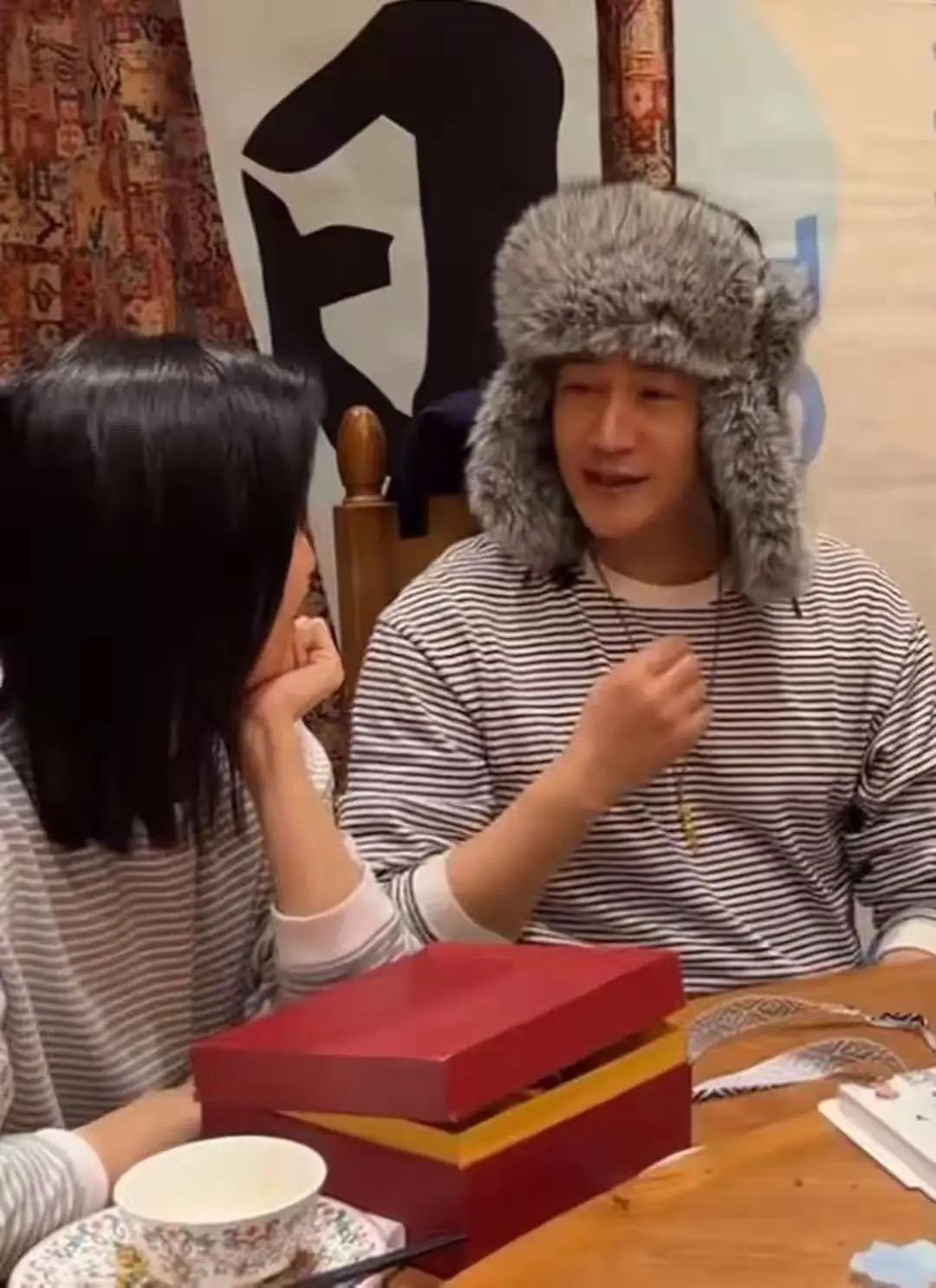 鮑蕾也送了禮物,是一頂很暖和的帽子,陸毅戴上帽子特別有喜感,去哈爾濱度假的話不怕冷了。