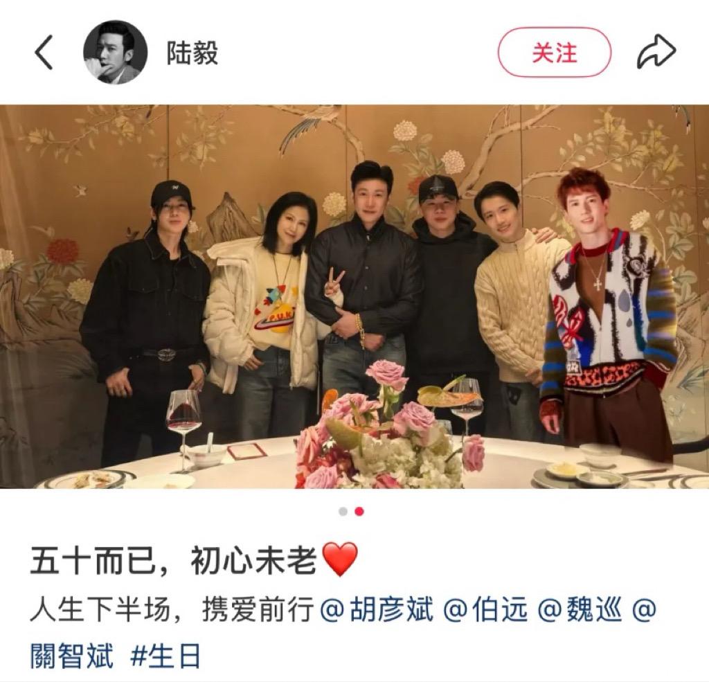 Ace組合的成員又聚在一起,除了關智斌沒有到場、胡彥斌、伯遠、魏巡都來了。陸毅還P了一張關智斌的精修照!