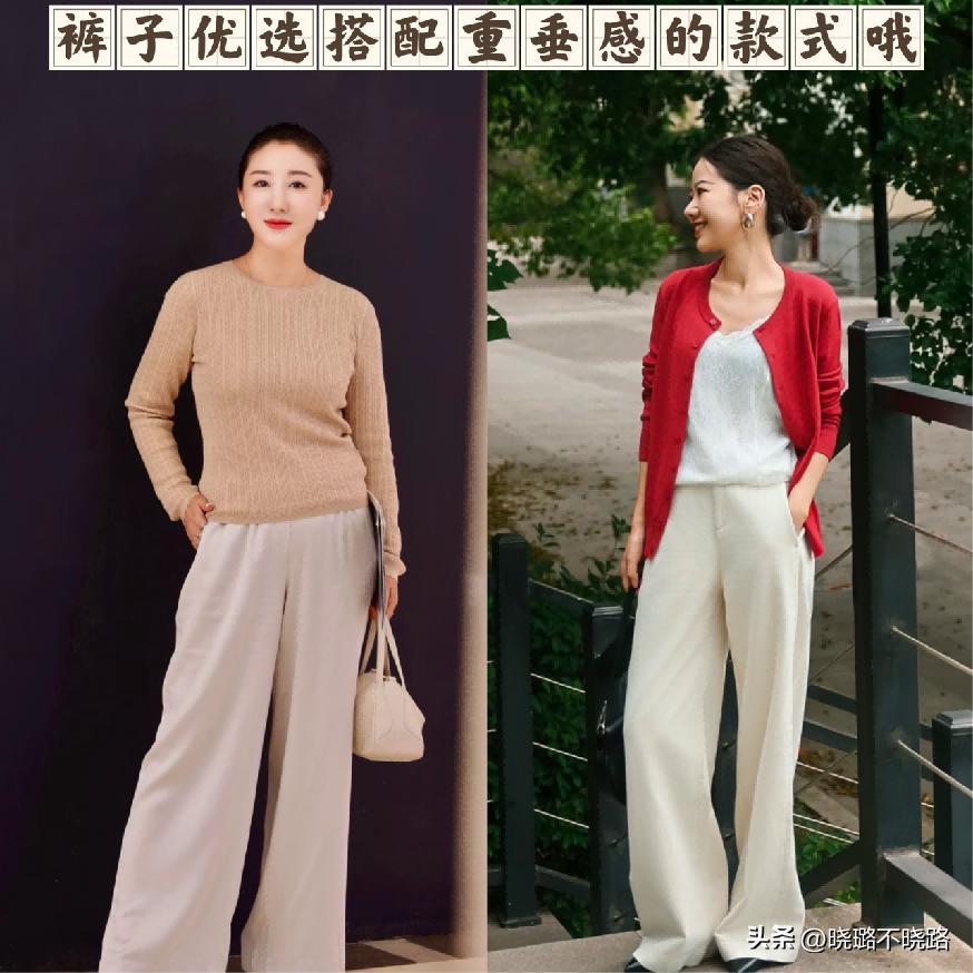 褲裝的搭配在這個時候一定是寬鬆的設計,首款就是垂感比較重一些的垂地褲來搭配,例如像長款的豆腐褲,又或者是新中式系列的褲裝,以及緞絨材質的褲裝,所展現出來的優雅以及貴氣的感覺真的是非常明顯,建議屏幕前各位上了年紀的女性,可以將這樣的褲裝多多進行搭配。