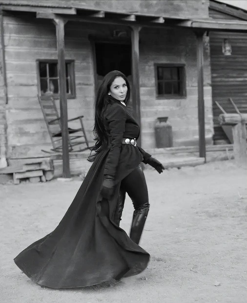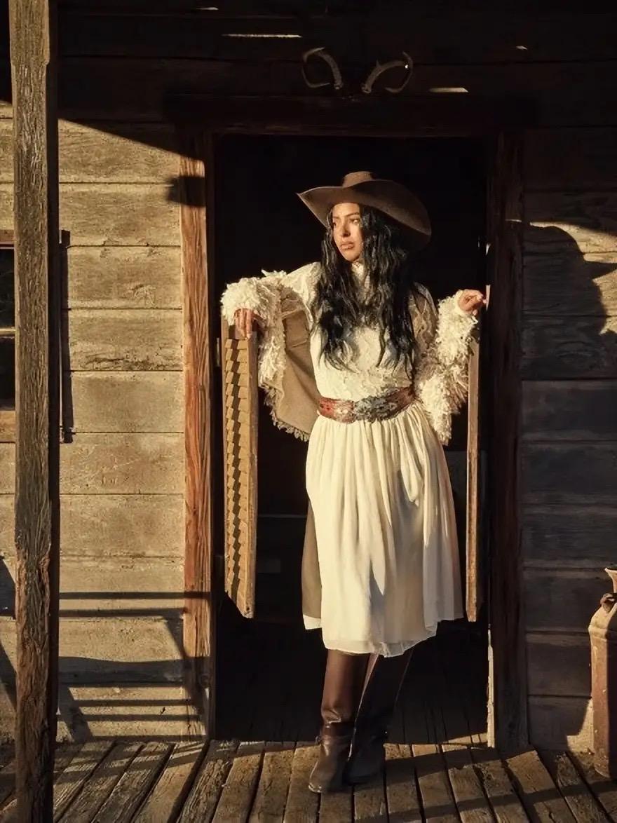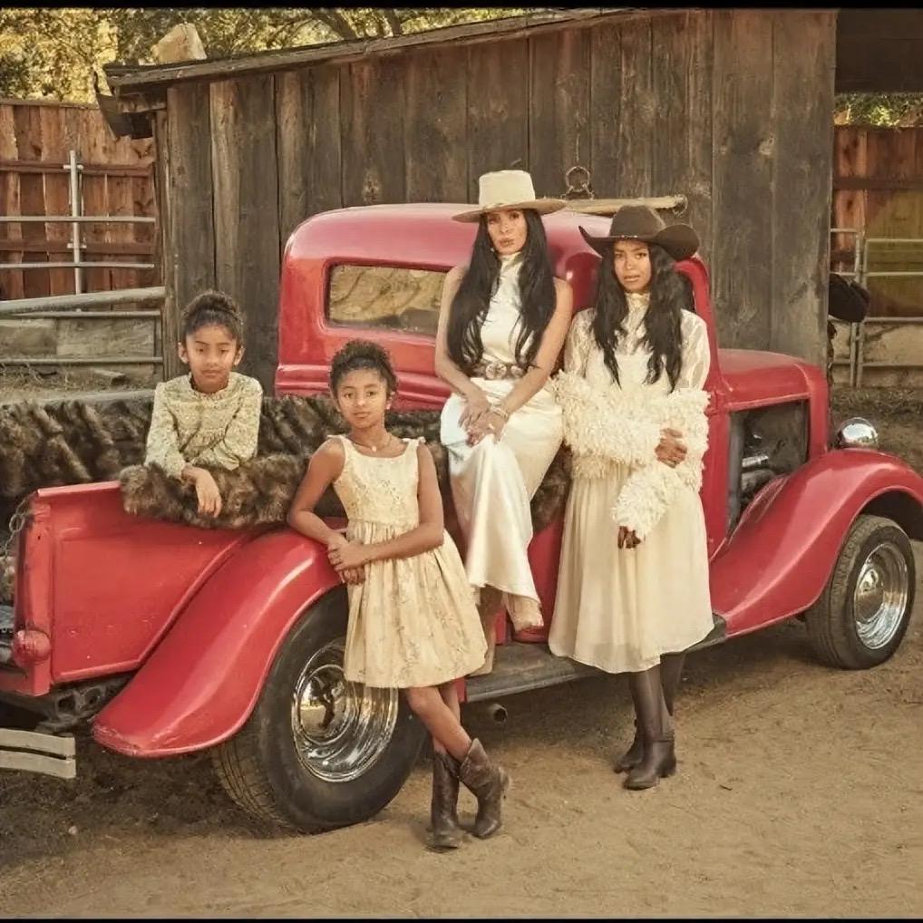 主打西部牛仔範,母女死人又酷又養顏。瓦妮莎和大女兒穿白裙、戴牛仔帽,很有氛圍感。