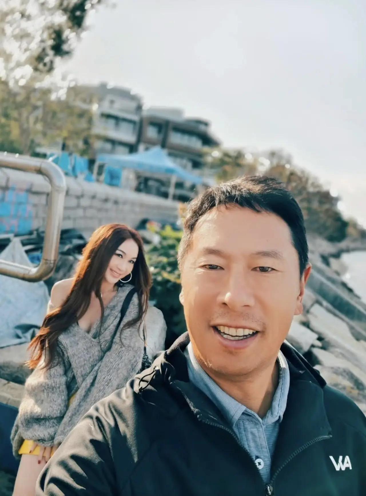 即便是在室外拍照的時候,溫碧霞也穿着吊帶裙、懷裏還抱着一隻可愛的白色小狗。他的繼子坐在她身後,看起來感情不錯。