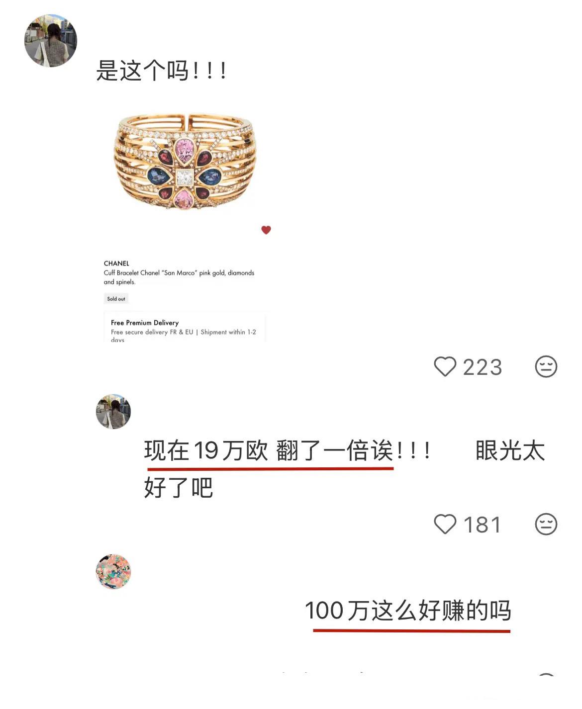 重點是,這隻鐲子還升值了。買的時候11萬歐,現在是19萬歐,足足賺了接近100萬。難怪說有錢人會越來越有錢,窮人真是賺不到認知以外的錢。