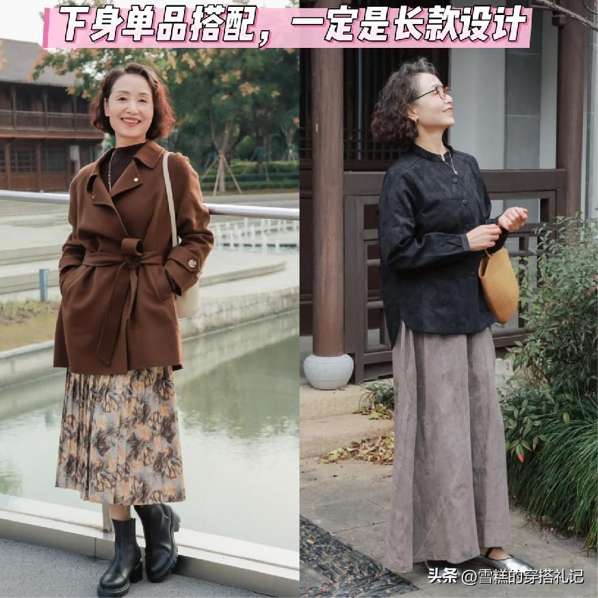 上了年紀之後在選擇下半身單品的時候,有一個非常關鍵的點,就是一定要將整個下半部分的腿部狀態都遮擋起來,例如像長款的褲裝和長款的裙裝,對於我們身材上的一些不足能夠很好的掩蓋和修飾,而且也能夠保證自上而下的線條走向是屬於利落和流暢的。