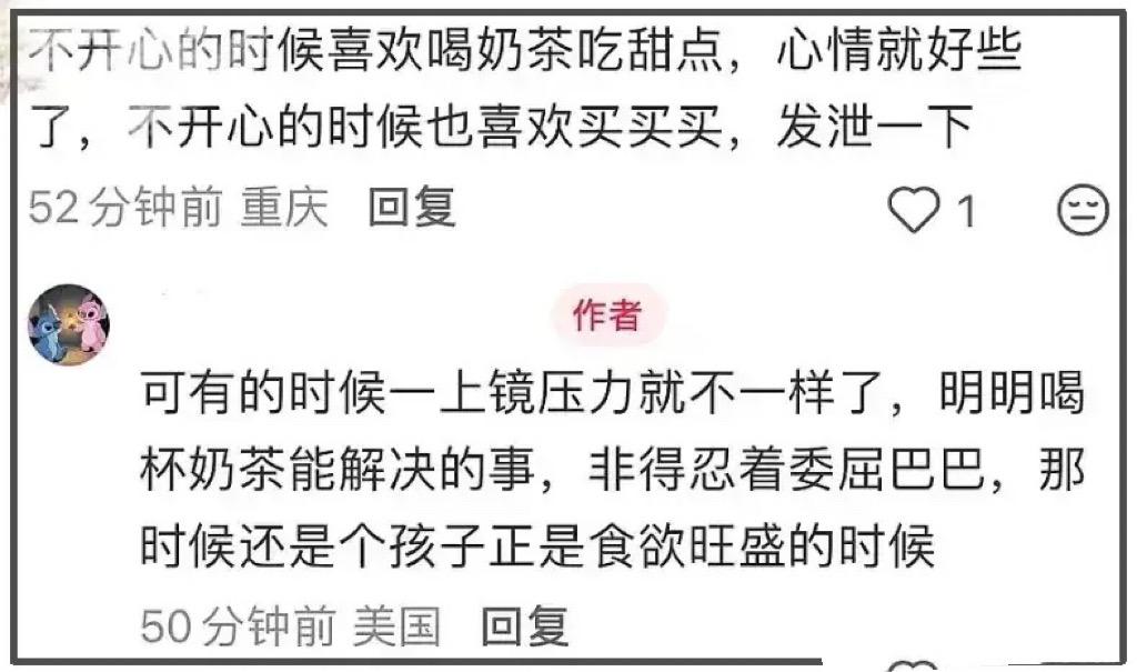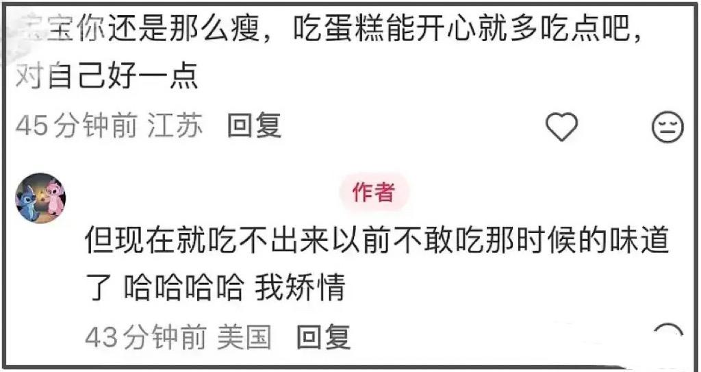 在評論區還熱情的跟網友互動,還是像以前一樣的爽言爽語。甚至有網友覺得她太瘦了,讓她多喫點蛋糕,她竟然說“喫不出來以前不敢喫那時候的味道了”。