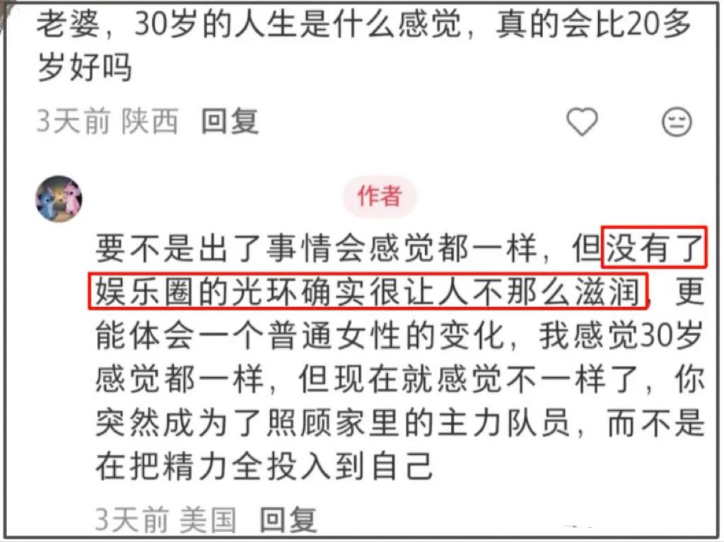 如果讓她說30歲的感覺真的會比20歲好嗎?那肯定是不一樣的。現在的她沒了娛樂圈光環,整個人像枯草一樣,不那麼滋潤。