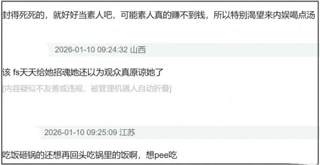 還是有清醒的網友,評論這種人就好好的當素人吧,就得封的死死的。喫飯砸鍋的還想再回頭喫鍋裏的飯,真是癡心妄想。