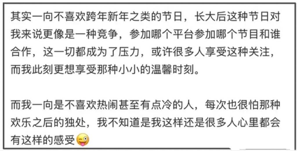 表達了自己不喜歡跨年新年之類的節目,因爲競爭太大、壓力也很大。自己不喜歡熱鬧、也害怕歡樂之後的獨處。
