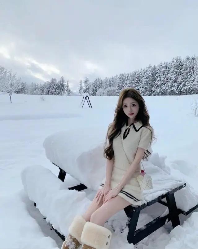 在大雪裏穿短裙,露着手臂、大腿,真的是太抗凍了。小臉緋紅,大概是凍得!