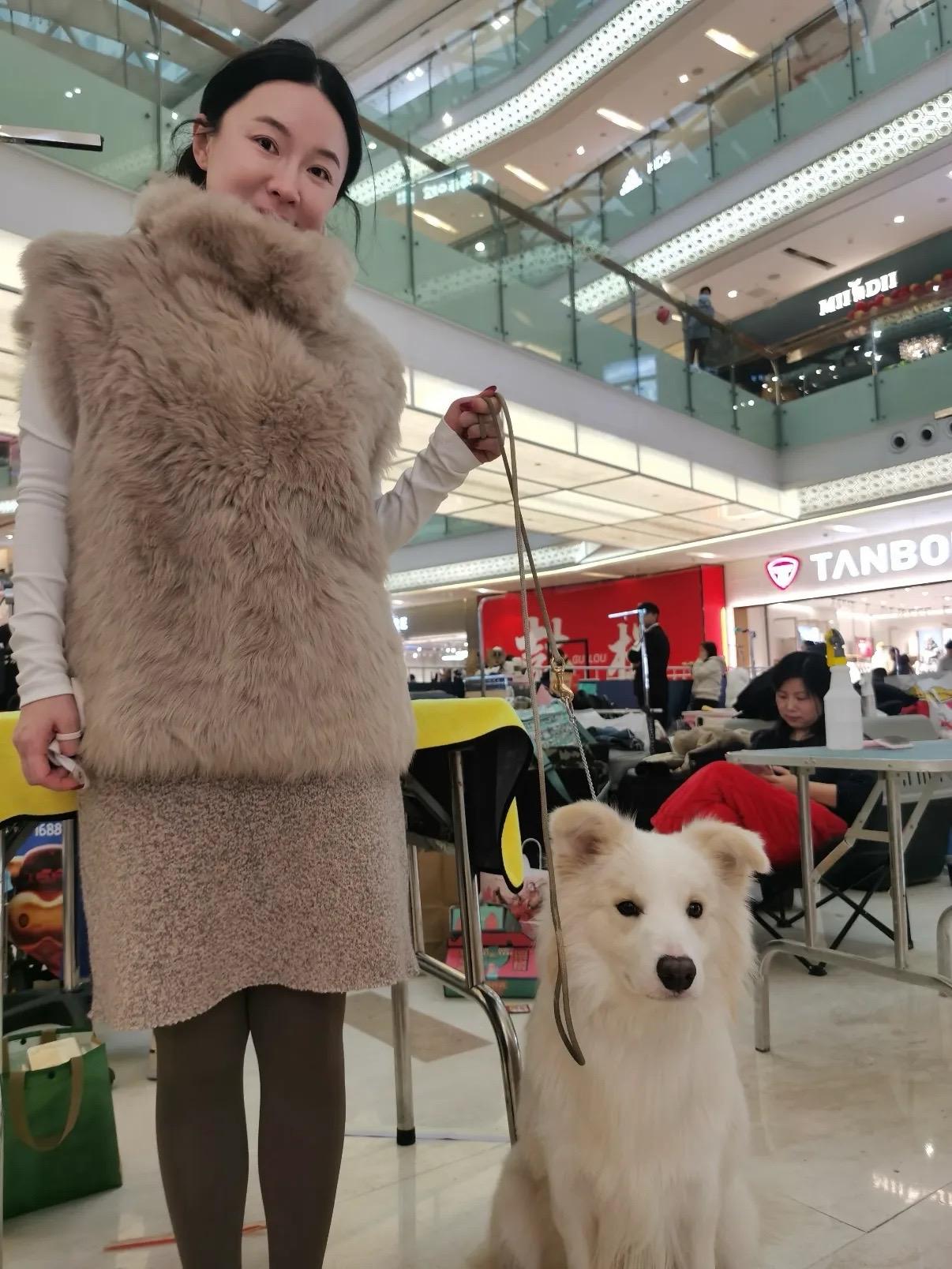 當天霍思燕穿了一件白色打底衫、淺棕色的皮草馬甲,看着非常富態。她把西施犬抱在懷裏,臉貼臉很親密。