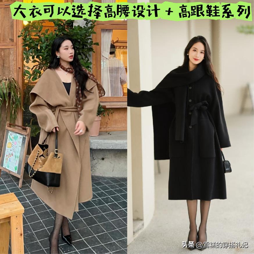 又或者在長款的大衣進行搭配的時候,我們也可以運用高腰設計的短裙,以此來遮擋住臀胯部位的不足,這對於梨形身材或者是線條走向不太好看的女性來說還是非常適用的,並且在這個時候所運用搭配的上衣也是屬於短款的設計,直接就將上短下長的比例也給體現了出來。
