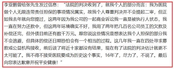 李亞鵬給房東張先生道歉,表示自己一直在努力還款中,個人擔保的部分不會逃避,但具體償還日期還要一個過程。