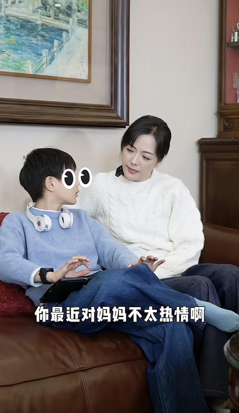 棕色的皮質沙發上,兒子沐沐正在玩平板,楊樂樂覺得兒子玩平板的時間太久了,就故意說對媽媽不太熱情,想要拉近母子關係。