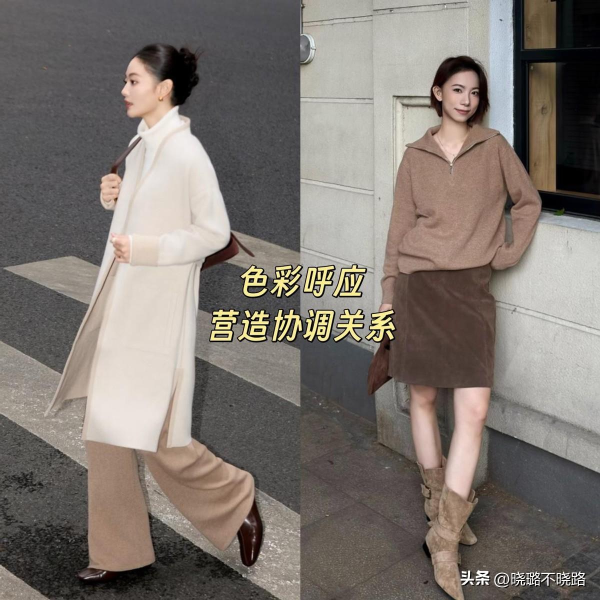 冬天穿羊絨衫,不僅僅要選對材質、款式,還要懂得正確的搭配核心,尤其是在配色方面,建議可以用到“色彩呼應法”,讓造型更加協調。