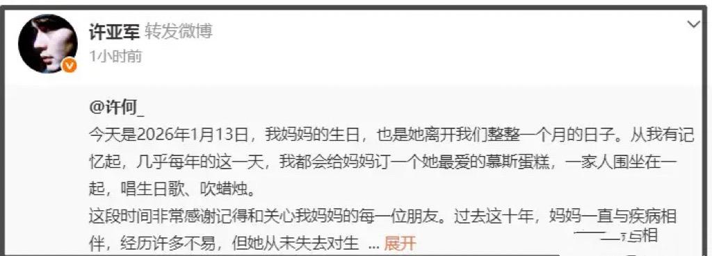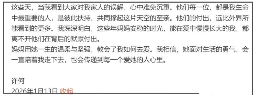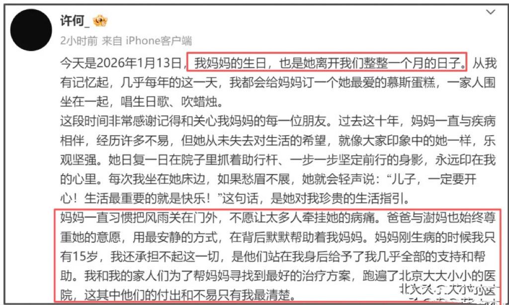 1月13日,是何晴離開一個月的日子,也是她的冥誕。24歲的兒子許何在社交平臺發文,字字句句情真意切,讓人看得熱淚盈眶。