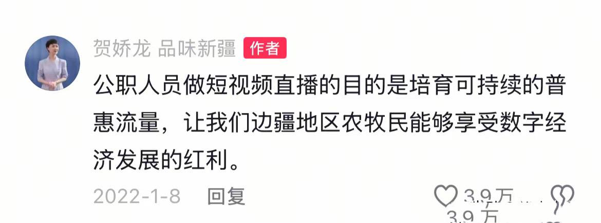 雖然後期不少網友對她的“網紅”路線存在質疑,賀嬌龍也給出回覆,表示公職人員做短視頻直播的目的就是培養和持續的普惠流量,讓邊疆地區的農牧民可以享受數字經濟發展紅利。