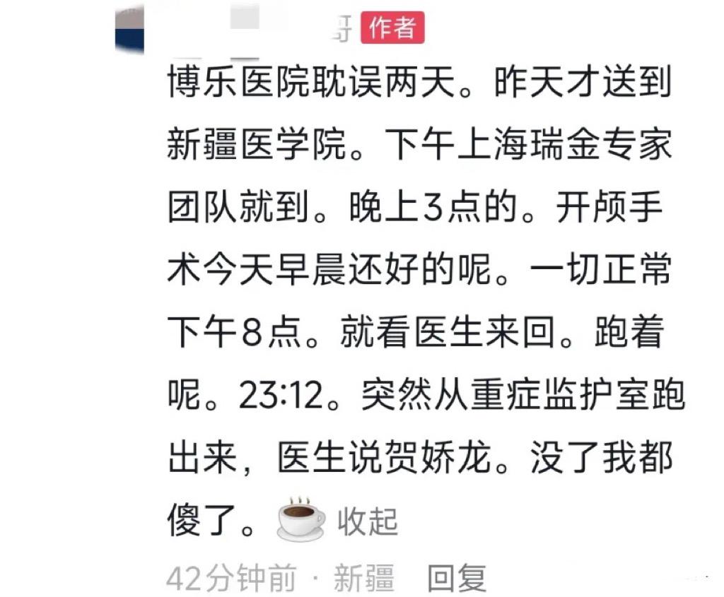 發生意外後,賀嬌龍頭部受傷。被送到了博樂醫院,後來又轉到新疆醫學院,上海專家團隊前來會診,計劃做開顱手術。