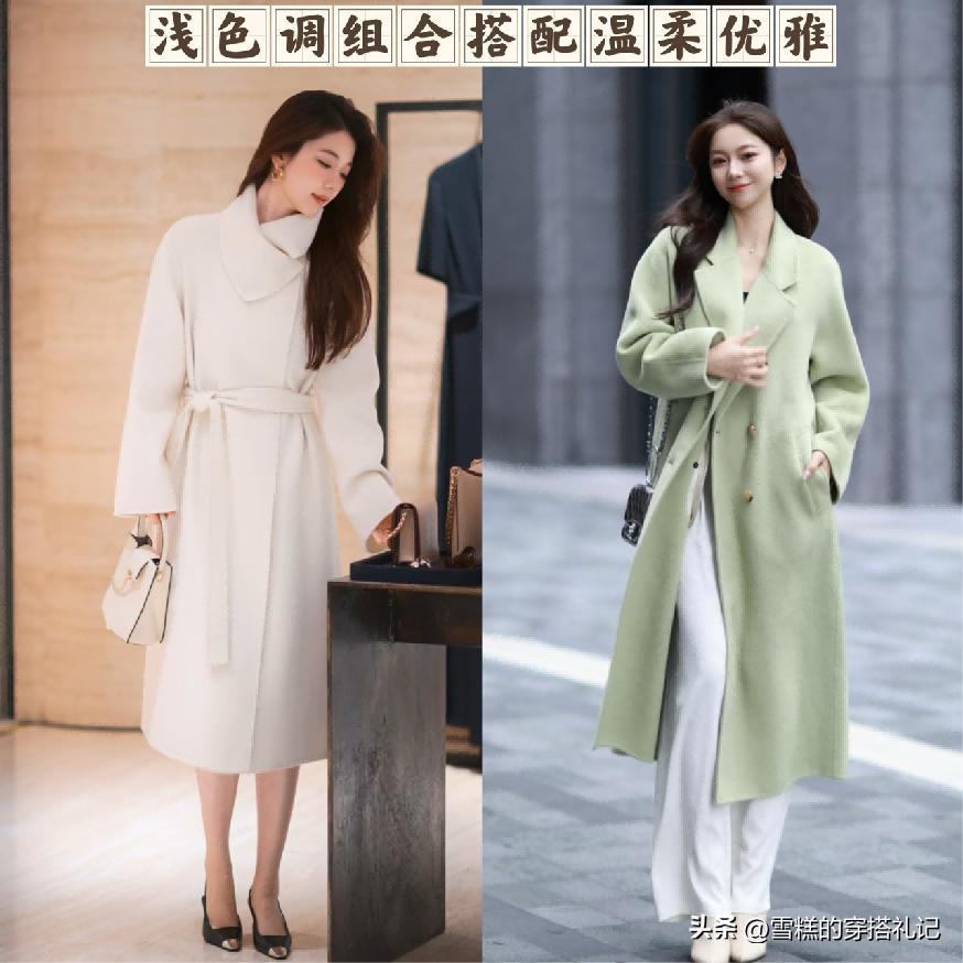 想要展現出來不同的氣質,那麼就非常有必要運用一些對應的單品來進行組合,淺色系列的大衣它本身展現的溫柔和優雅感就很明顯,在這個時候也可以直接選擇搭配淺色系的內搭。
