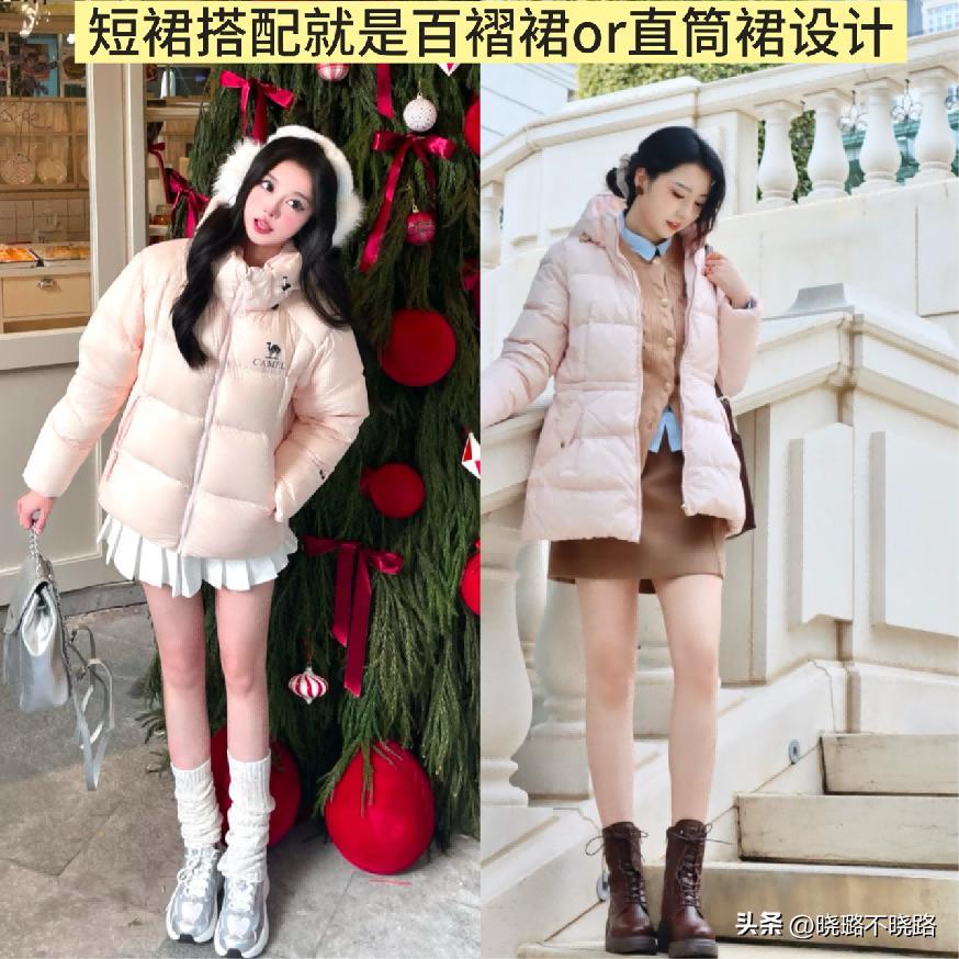 羽絨服+短款裙裝的搭配如今對於不少年輕的女性而言,絕對是屬於有着很高頻率的搭配優選的存在了,款式系列的搭配優選也是以百褶裙、直筒的短裙設計爲主,呈現出來的效果會是顯瘦好看且能夠優化身形線條走向的優勢哦,梨型身材、大腿線條不好看的女性可以放心的選擇,這樣的搭配只需要將纖細的推腿型展現出來就好哦!