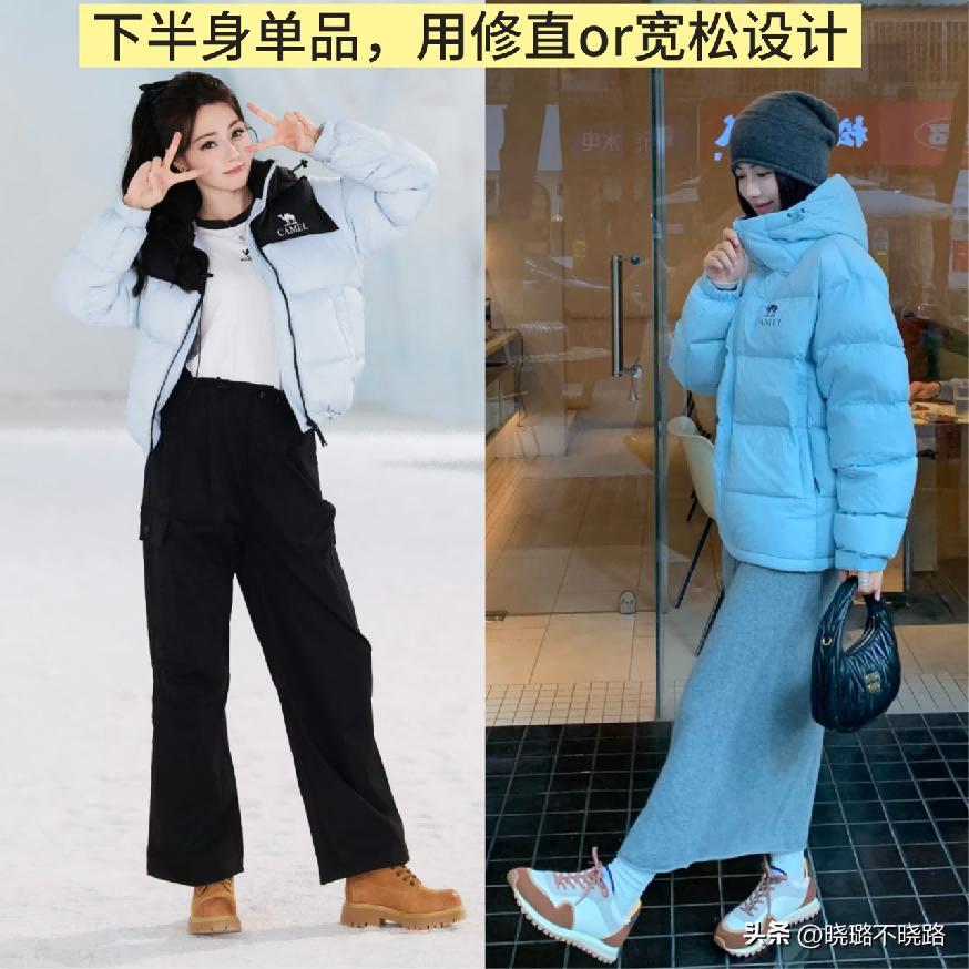 如若你的身材屬於個子小、或者是微胖感會比較明顯一些的狀態,那麼羽絨服系列的穿搭其實可以多多呈現出來上短下長的組合搭配,這樣在視覺上的體現就可以展現很利落的穿搭效應,從而削弱羽絨服本身帶來的“蓬鬆感”,二來也可以讓整體的身心狀態顯得更爲高挑好看,下半部分的單品最好是可以結合增高系列的鞋子哦!