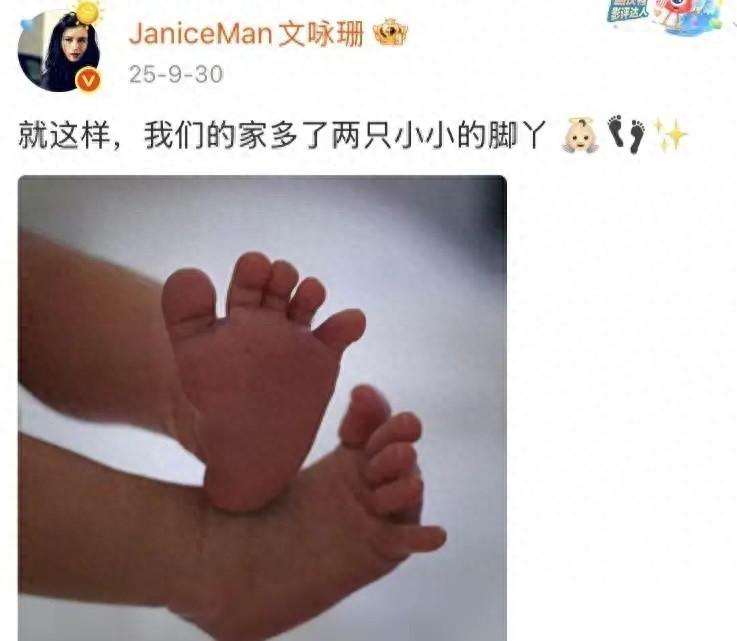 2025年9月30日,文詠珊官宣產子。曬圖:兩隻小腳丫。配文:就這樣,我們家多了兩隻小小的腳丫。